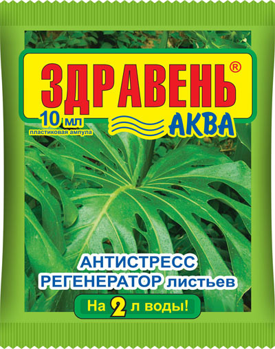 «Здравень-аква антистресс регенератор листьев» — жидкое комплексное органо­минеральное удобрение для внекорневых подкормок всех культур при пожелтении листьев в личных подсобных хо­зяйствах и комнатных цвето­водствах.