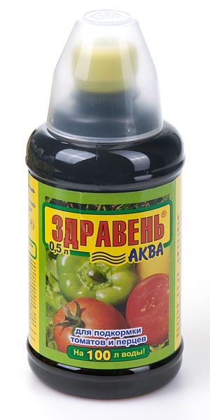 «ЗДРАВЕНЬ-АКВА для подкормки томатов и перцев» — жидкое комплексное органоминеральное удобрение для корневых и внекорневых подкормок томатов и перцев в личных подсобных хозяйствах.