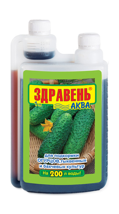 «ЗДРАВЕНЬ-АКВА ОГУРЦЫ» — жидкое комплексное органоминеральное удобрение для корневых и внекорневых подкормок огурцов, тыквенных и бахчевых культур в личных подсобных хозяйствах.